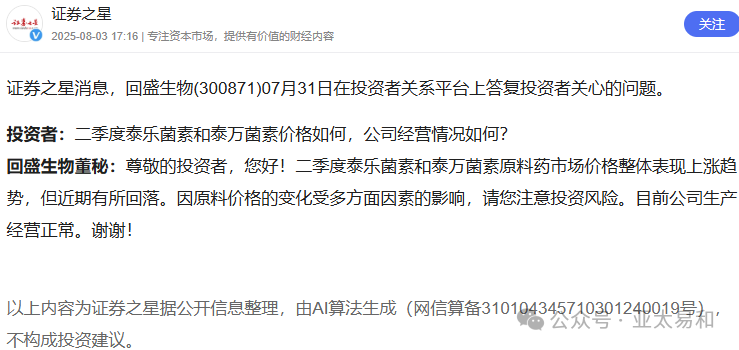 回盛生物董秘:尊敬的投资者,您好!二季度泰乐菌素和泰万菌素原料药市场价格整体表现上涨趋势,但近期有所回落。因原料价格的变化受多方面因素的影响,请您注意投资风险。目前公司生产经营正常。谢谢!